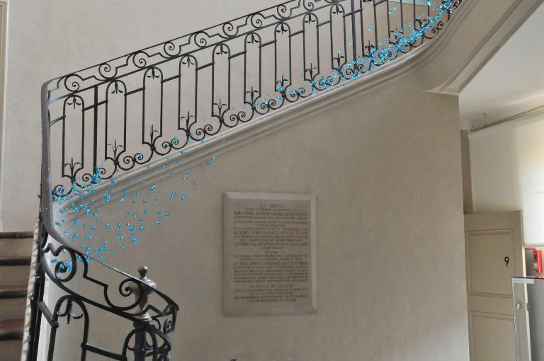 Oeuvre composée de fils tendus et de pampilles en cristal de Baccarat bleues, tendus dans la cage d'escalier. Les pampilles sont reliées entre elles par : 9 fils en partie basse 13 fils en partie médiane 8 fils en partie haute Taille variable selon l'accrochage.